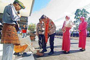 Kapolres Sintang yang baru, AKBP Dwi Prasetyo Wibowo tiba di Mapolres Sintang disambut dengan tradisi pedang pora sekaligus upacara adat Dayak dan Melayu di halaman Mapolres Sintang, Selasa (18/7) pagi.