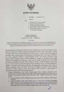 “Diberitahukan kepada seluruh masyarakat Kabupaten Ketapang, bahwa berdasar pada Surat Edaran Bupati No. 420/0101/DISDIK-B1, tanggal 14 Januari 2021, tentang Penyelenggaraan Pendidikan Tatap Muka di Satuan Pendidikan PAUD, SD, SMP dan Satuan Pendidikan Kesetaraan Tahun Pelajaran 2020/2021 di Masa Pandemi Corona Virus Desease (Covid-19), dapat dilaksanakan secara serentak dan bersyarat pada tanggal 18 Januari 2021,” Bupati Ketapang melalui Surat Edarannya.