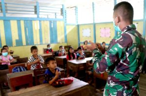 Cegah Penyebaran Covid-19, Satgas TMMD Bagikan Masker Kepada Anak Sekolah Perbatasan