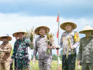 Usai mengikuti zoom meeting bersama Presiden Republik Indonesia secara serentak di 14 provinsi dan 157 Kabupaten/Kota seluruh Indonesia, Bupati bersama jajaran forkopimda melakukan panen raya padi.
