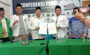 LINTASKAPUAS I KETAPANG – Pasangan bakal calon Bupati dan Wakil Bupati Ketapang, Junaidi – Sahrani menggelar Konferensi Pers di Sekretariat Koalisi Rakyat Bersatu (KRB) yang beralamat Jalan R Suprapto pada Senin (20/07/2020) sekitar pukul 16.00 Wib.