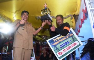 “untuk sepakbola juara 1 mendapatkan hadiah uang pembinaan 15juta, juara 2 mendapatkan uang pembinaan 8 juta, juara 3 mendapatkan uang pembinaan 5 juta dan juara harapan mendapatkan uang pembinaan 3juta rupiah, sementara untuk bola voli putri juara 1 uang pembinaan 3juta, juara 2 mendapatkan 2juta, juara 3 mendapatkan 1,5juta dan juara 4 atau harapan mendapatkan uang pembinaan 500ribu rupaih, masing-masing juara juga mendapatkan piala tetap turnamen tersebut”tutup hamid.