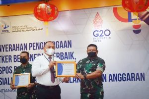LINTASKAPUAS | PONTIANAK – Komandan Korem 121/Abw Brigjen TNI Dr. Ronny, S.AP., M.M., menerima penghargaan sebagai Satker terbaik dengan pencapaian Indikator Kinerja Pelaksanaan Anggaran (IKPA) dan penyerapan anggaran terbaik tingkat TNI-AD, bertempat di Aula Kanwil Kalimantan Barat, Senin (14/03/2022).