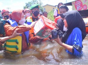 Menteri Sosial Tri Rismaharini, bersama Ketua Komisi V DPR RI Lasarus langsung menyambangi warga kelurahan Ulak Jaya menggunakan perahu karet sambil menyerahkan bantuan kepada para warga yang terdampak banjir.