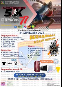 Rencananya Kartika Senentang 5 K ini akan digelar pada hari Minggu, 2 Oktober 2022 dengan rute di sekitar Kota Sintang. Pasiter Kodim Sintang, Kapten Inf Didik menjelaskan, bagi masyarakat yang berminat mengikuti lomba ini bisa datang langsung ke beberapa tempat pendaftaran, di antaranya Eks Lapter Susilo, Makodim 1205/Sintang, Makoramil 07/Sintang, Warkop 77 Lintas Melawi maupun di GOR Stadion Baning. Atau bisa langsung menghubungi ke WA saya 081258313470.