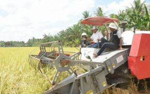 Sekda Ketapang, Farhan menaiki alat pemanen padi ketika panen raya kelompok tani Tunas Baru Desa Sungai Bakau, Kecamatan Matan Hilir Selatan, Jumat (21/8/2020). Foto: Humpro Pemda Ketapang
