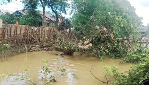LINTASKAPUAS | SINTANG -Akibat tidak mampu menahan beban material tanggul pengendali banjir yang dibangun Kementerian PUPR, kembali longsor dan sebatang pohon tumbang menimpa rumah keramba ikan milik warga.