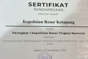 LINTASKAPUAS I KETAPANG – Kepolisian Resor (Polres) Ketapang meraih penghargaan dari Komisi Pemberantasan Korupsi Republik Indonesia (KPK RI) dengan kategori Pringkat I Penyelesaian Perkara Tindak Pidana Korupsi (Tipikor) Tahun 2024 Polres Tingkat Nasional.