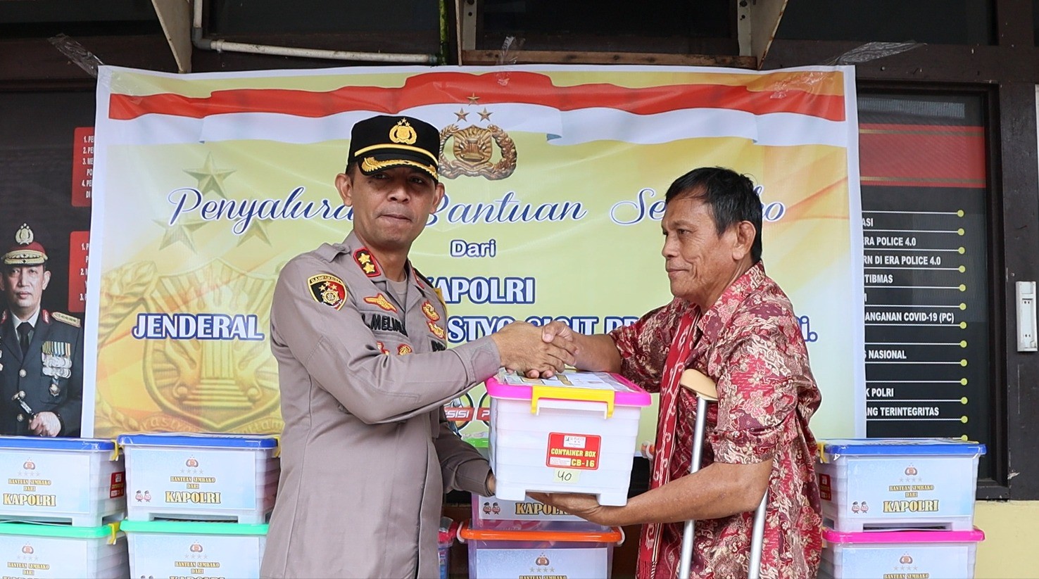“Pengiriman dan pendistribusian bantuan kemanusian dari Kapolri berupa 500 paket kemasan sembako yang berisi beras, gula, susu kaleng, teh celup, mei goreng kemasan serta ikan sarden,” jelasnya